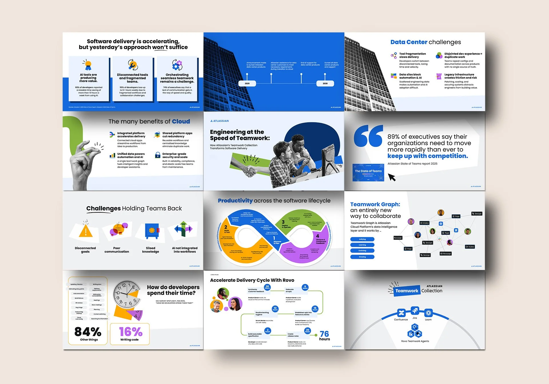 I designed a suite of marketing materials for Atlassian, including presentations, an eBook, social graphics, and one-pagers. Partnering closely with product marketing and content teams, I implemented Atlassian’s brand style guide across all assets, ensuring consistency in typography, color, imagery, and layout. The resulting materials strengthened brand alignment and supported efficient production across marketing channels.